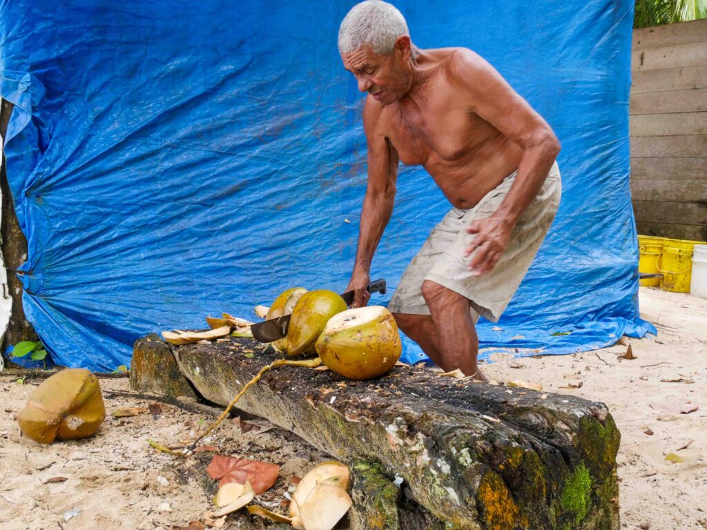 Na ruim een uur kom je bij Polo Beach waar je het meest originele ‘restaurant’ van het eiland vindt. Tussen haakjes dan, want meer dan een in elkaar getimmerd hutje is het niet. Het strand is vernoemd naar Polo zelf, de enige bewoner die zich in de jaren ‘70 op dit stukje eiland vestigde. Hij kookt met liefde een hapje voor je op open vuur. Wat dacht je van triggerfish en kokosrijst? Dorst? Dan slaat hij met liefde (en twee rake klappen) een kokosnoot voor je open. Ik hoop met heel mijn hart dat Polo nog lang zijn ‘restaurant’ blijft runnen want authentieker dan dit wordt het niet.