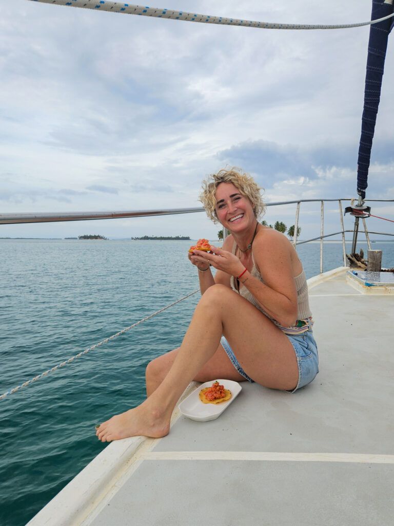 Sommige zijn wat groter, een enkele zelfs met geïmproviseerde cocktailbar en al, en een andere van de categorie ‘mini’ met 1 palmboom op slechts een stipje zand – check de emoticon op je telefoon, dan weet je wat ik bedoel ;-). In een baai ga je voor anker en dan is de keuze aan jou. Ga je snorkelen rondom de boot, zonnen op het dek of met het kleine bootje naar het eiland. Meestal slaap je elke dag wel op een andere plek en bezoek je overdag andere baaitjes en eilanden. Lig je voor anker, dan peddelen de Kuna’s langs in hun uitgeholde boomstammen om vis of fruit te verkopen. Als de avond valt, weet je in ieder geval alvast wat er op je bord ligt. Het is zojuist vers aan boord gebracht.